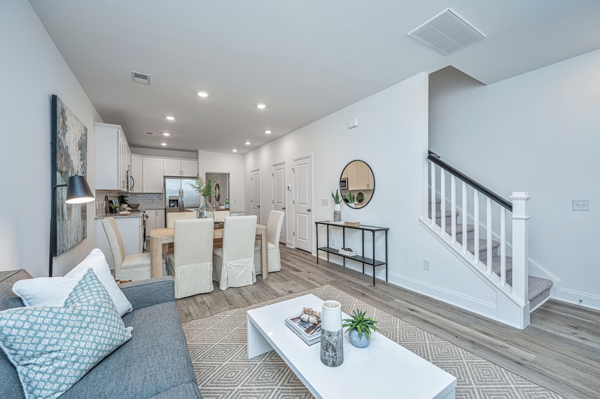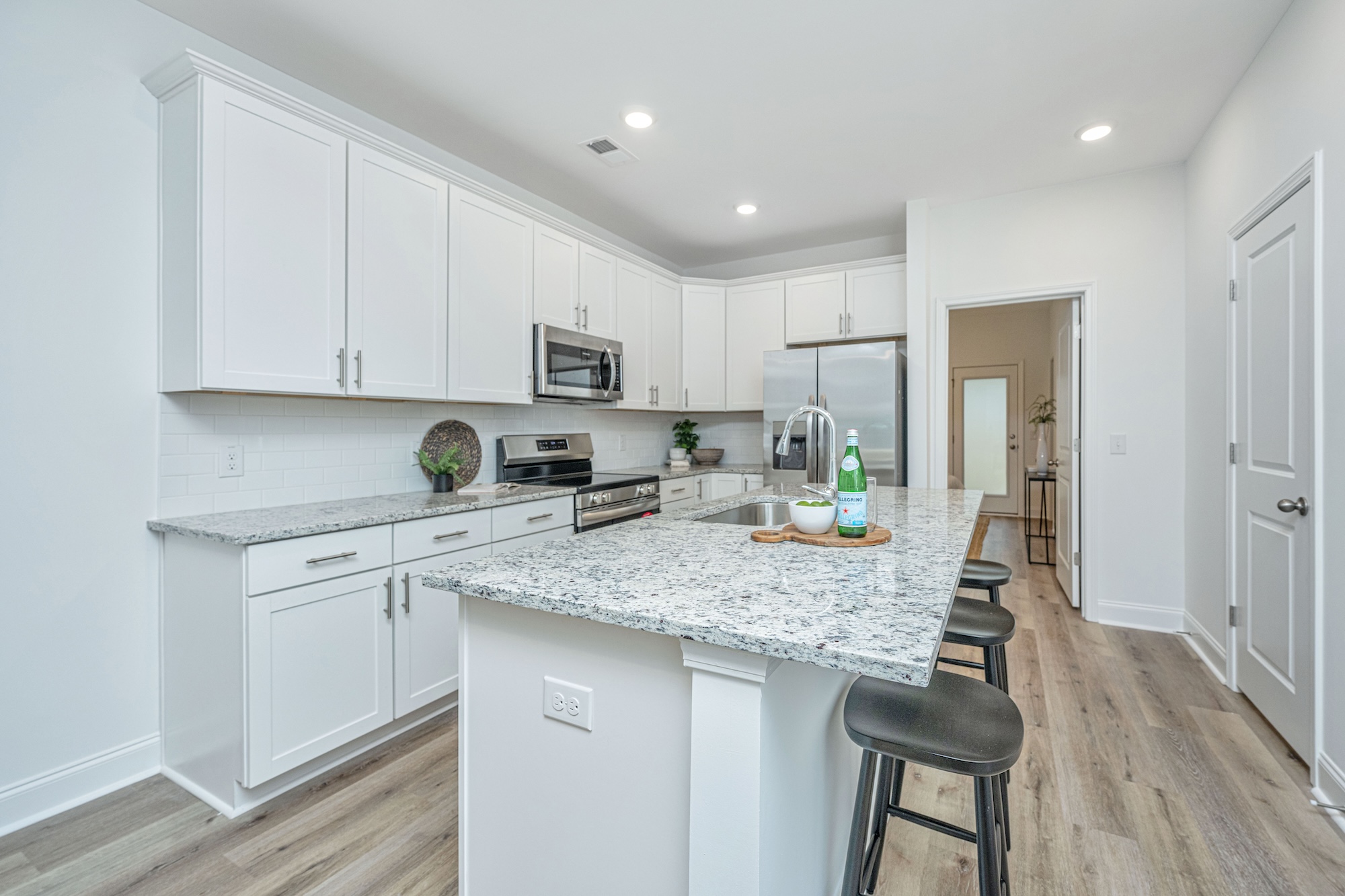Twin Rivers Towns has two-bedroom and three-bedroom townhomes available for sale. This gallery shows our contemporary style homes with covered patios and beautiful interior features like nine-foot ceilings, vinyl floor planking, granite countertops, subway tile backsplash, 42-inch kitchen cabinets, stainless steel appliances and more. Reach out to our Sales Team to learn more about this new community or start your home buying process today.